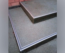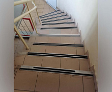 Способ монтажа: алюминиевый порожек без вставки крепится в проем между двумя напольными покрытиями или на ступени при помощи саморезов (идут в комплекте). Затем прорезиненную ПВХ вставку нужно нагреть строительным или обычным феном, либо подержать в горячей воде, чтобы материал стал мягче и легче вошел в паз профиля.